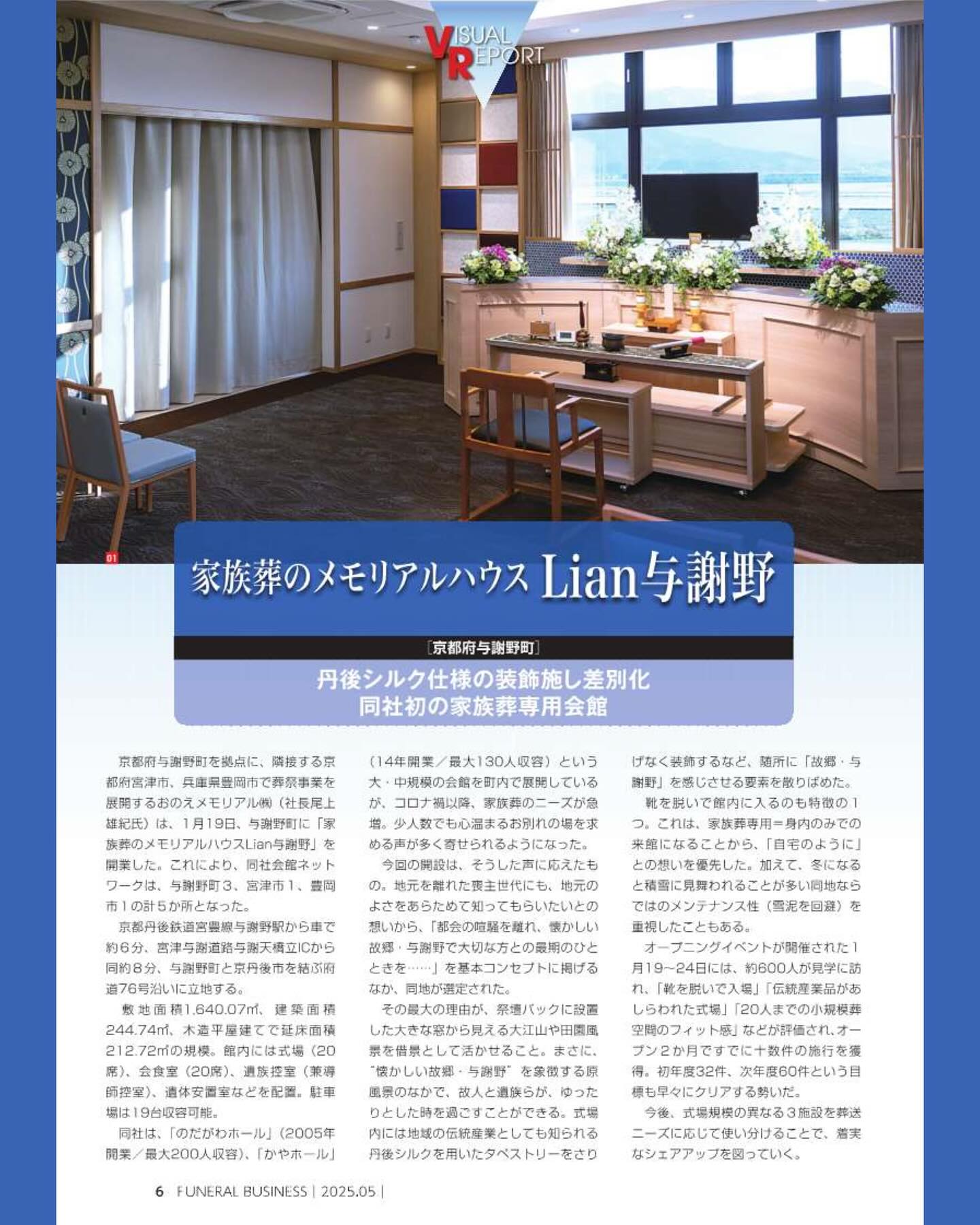 2025/4/27弊社新ホールが月刊フューネラルビジネス5月号に掲載されました。 2月号にも掲載していただきましたが、今月号は3ページにも渡り特集をしていただきました。リアン与謝野は弊社初の家族葬専用ホールです。 詳細の説明をご希望の方は…