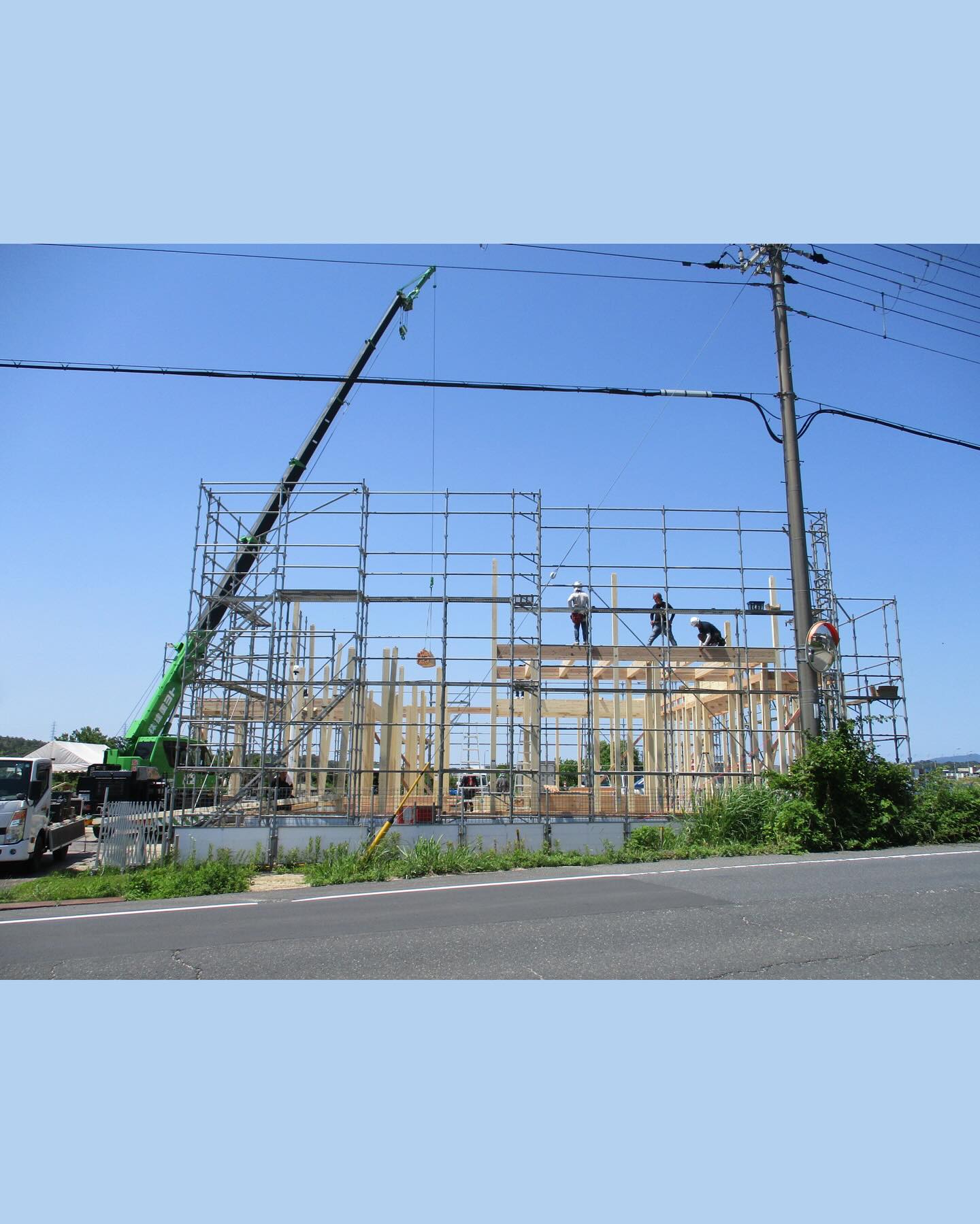 2025/6/5先日、京丹後市峰山の当社新ホールの建て方が完了しました。 当日は快晴で、めでたい日にふさわしい空模様でした。新たな情報が出ましたらまたお知らせいたします。